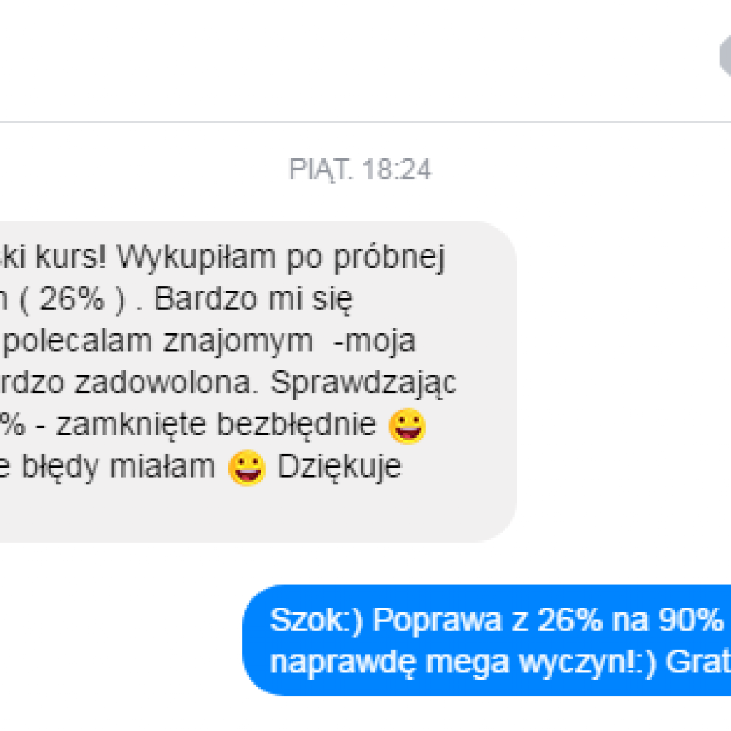 Fakt 2: Jeśli poświęcisz kilka- kilkanaście tygodni, możesz bez problemu opanować to, co zapewni Ci dobrze zdaną maturę, bez stresu. Mam wiele udokumentowanych przypadków osób, które po kilku tygodniach nauki podnosiły swój poziom maturalny z około 20% w okolice 60-70%. Moja rekordzistka, w 5 tygodni poprawiła swój wynik z 22% na 86%!