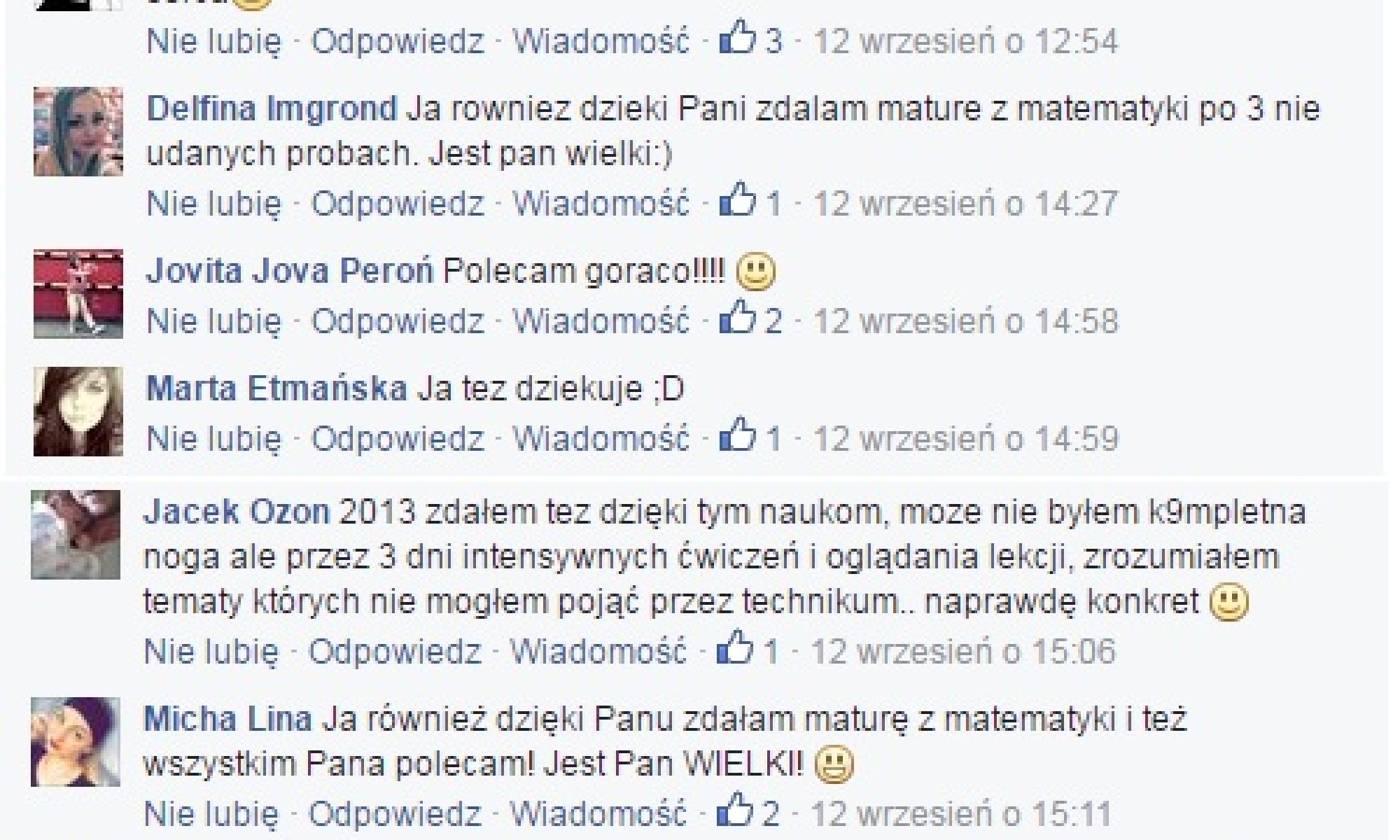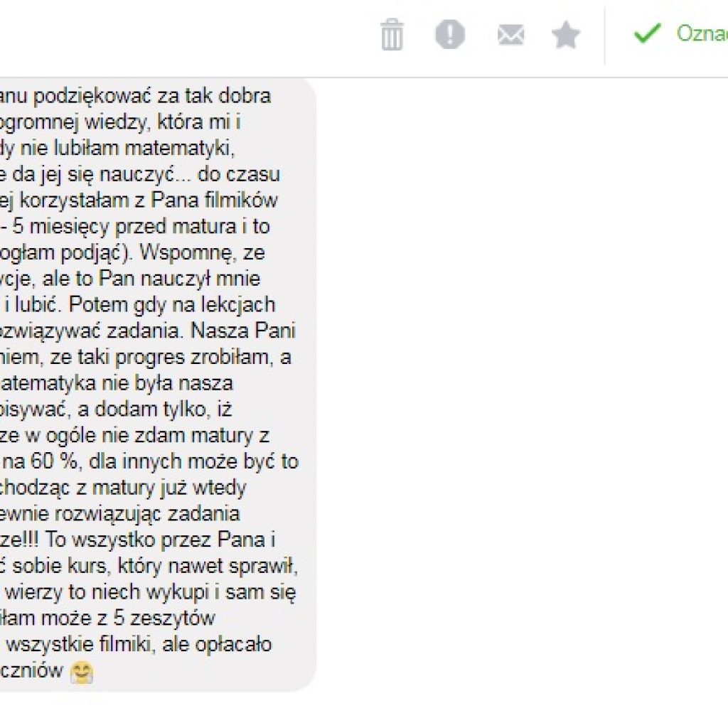 Ale spokojnie, to nie jest noszenie worków z cementem! Otrzymasz dobrze opracowany i przystępny materiał video, który zmieni Twoje nastawienie do matematyki. Wyobraź sobie, siadasz wieczorem z herbatą przed monitorem, wyciągasz zeszyt na notatki i rozpoczynasz seans video z daną lekcją. Jeśli czegoś nie zrozumiesz cofasz nagranie do momentu, w którym zgubiłeś wątek, prawda, że przyjemna perspektywa? Tysiące osób woli taki sposób własnej nauki niż marnowanie czasu w klasie, w której często nie ma warunków do słuchania i uczenia się. Znasz to?